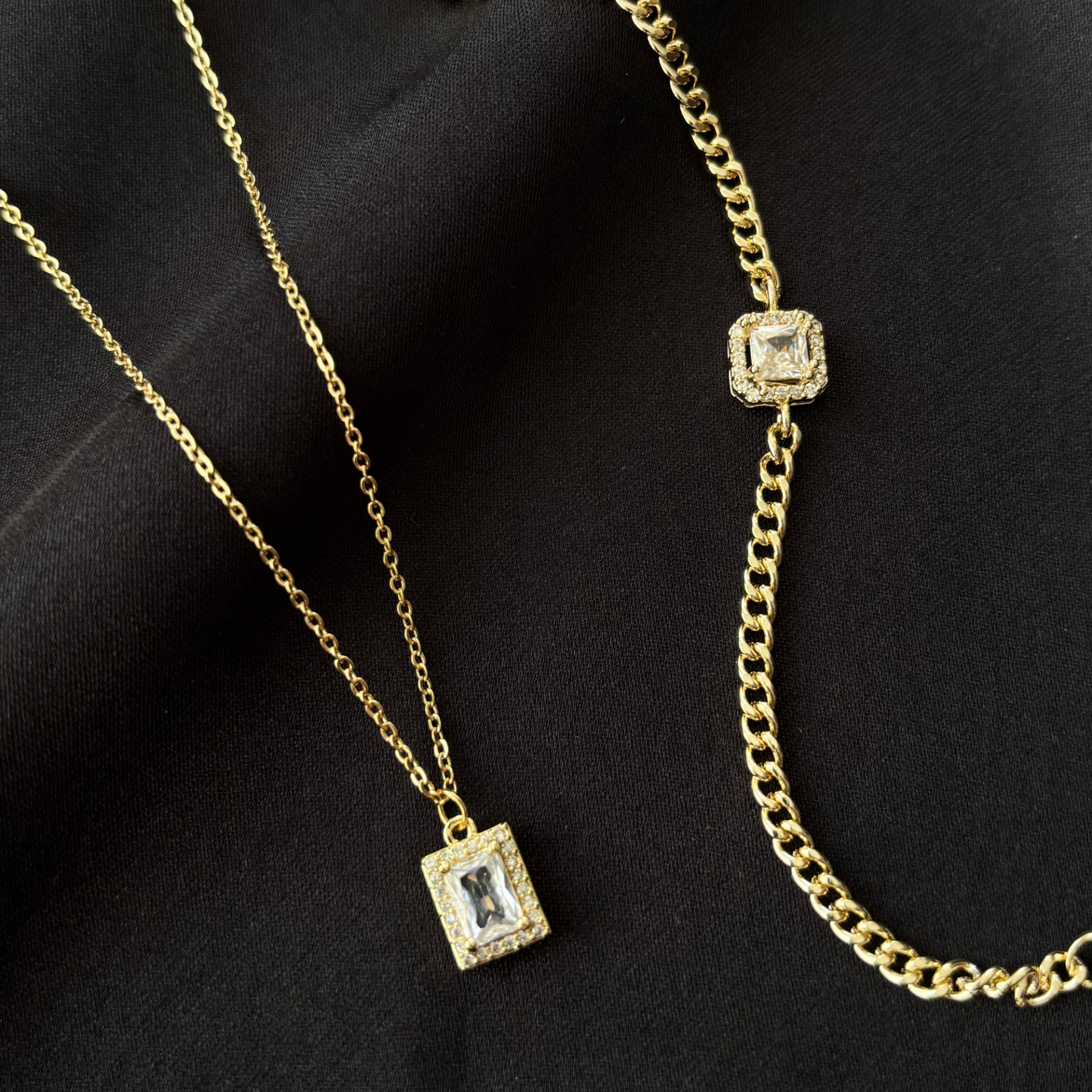 Zamansız şıklığın simgesi baget taşlarla tasarlanan bu set, minimal çizgisi ve zarif ışıltısıyla öne çıkar. Kolye ve bileklikten oluşan bu özel kombin, günlük stilinize zarafet katarken özel anlarda da şık bir tamamlayıcı olur. Hem sade hem dikkat çekici bir görünüm arayanlar için ideal bir seçimdir.
