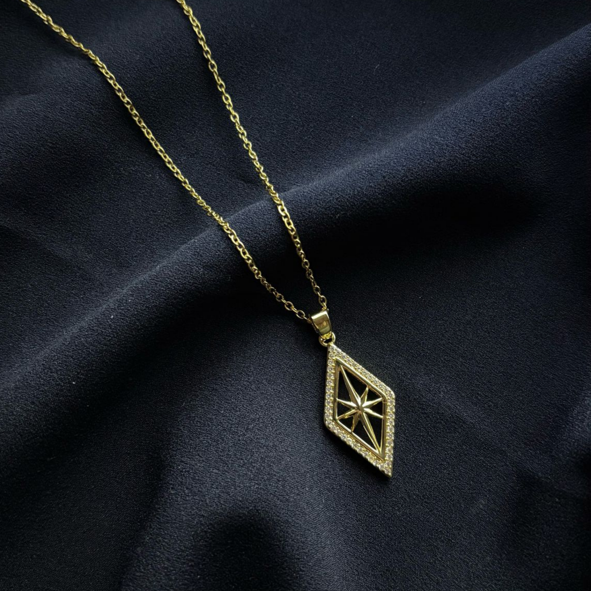 Yolunu kendi çizenler için tasarlandı! Çelik Taşlı Üçgen Pusula Kolye, özgürlüğü, yön bulmayı ve kararlılığı simgeleyen güçlü bir aksesuar.