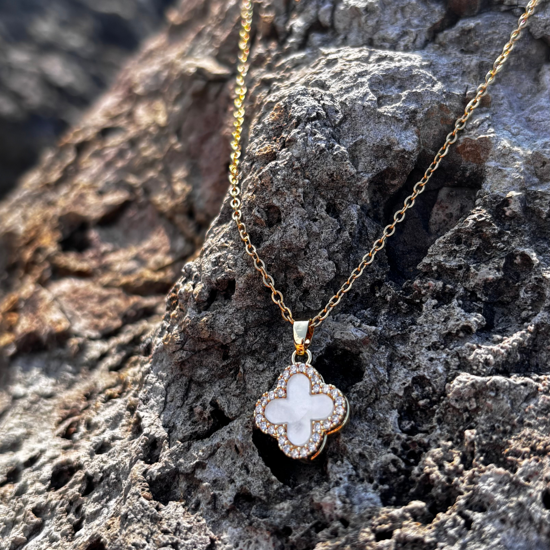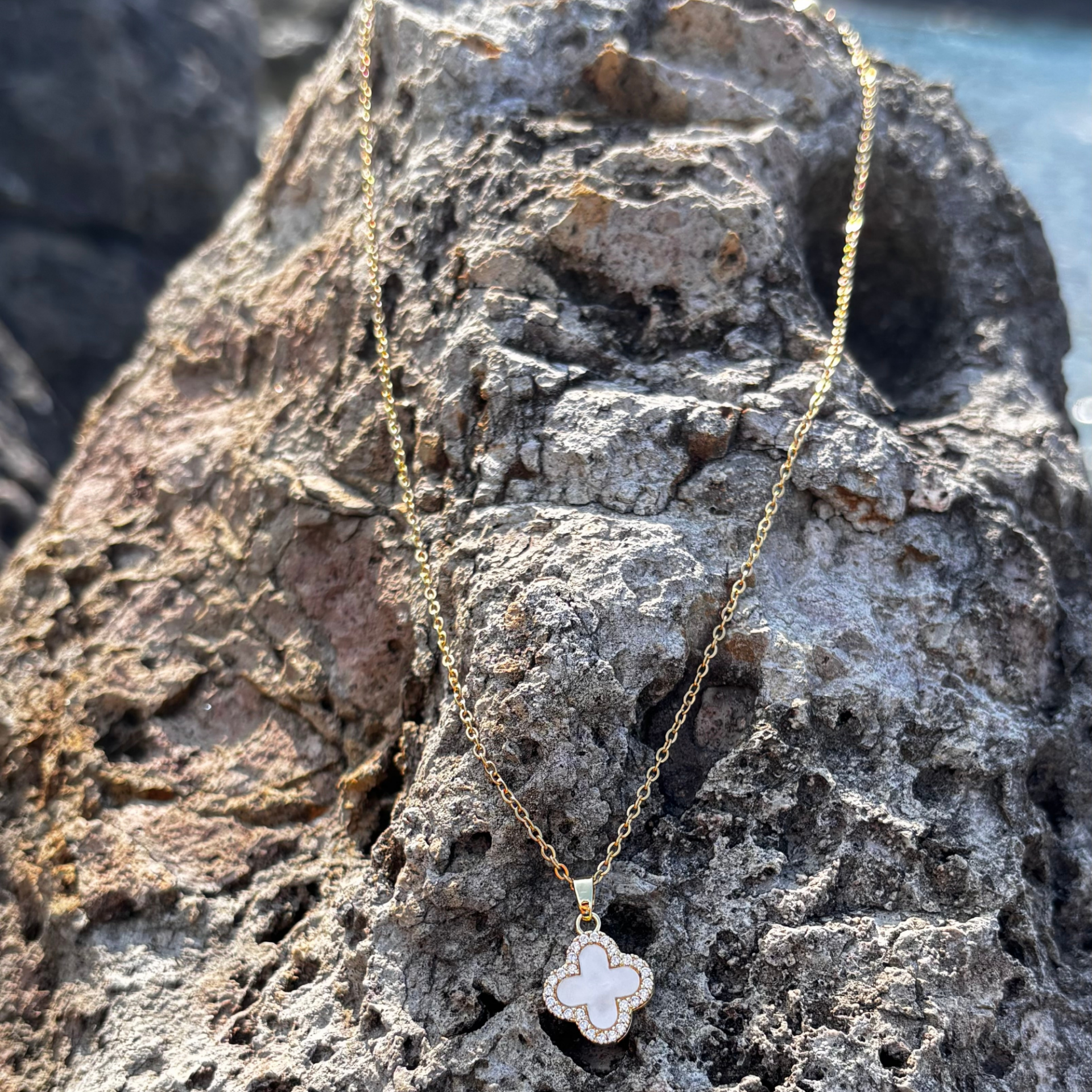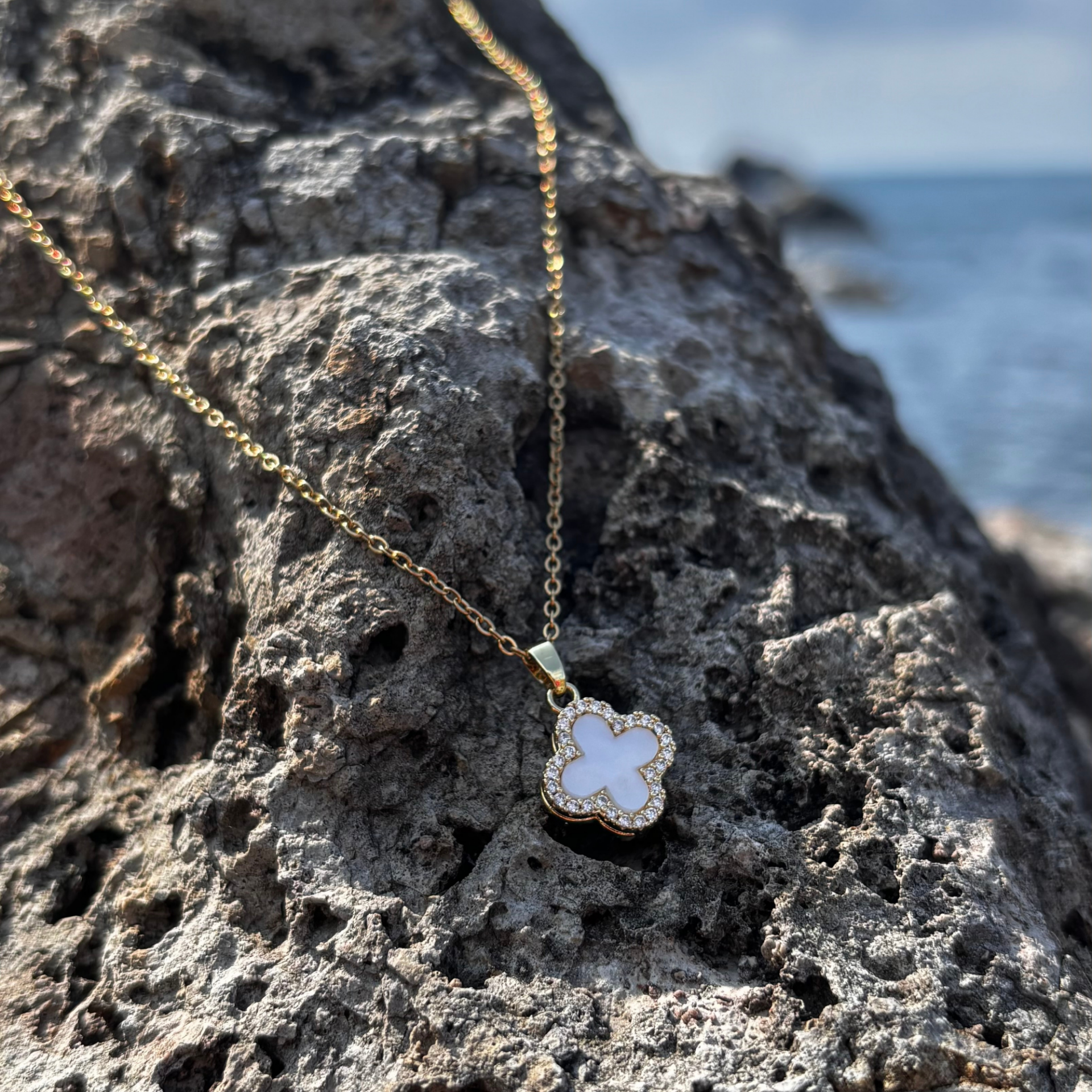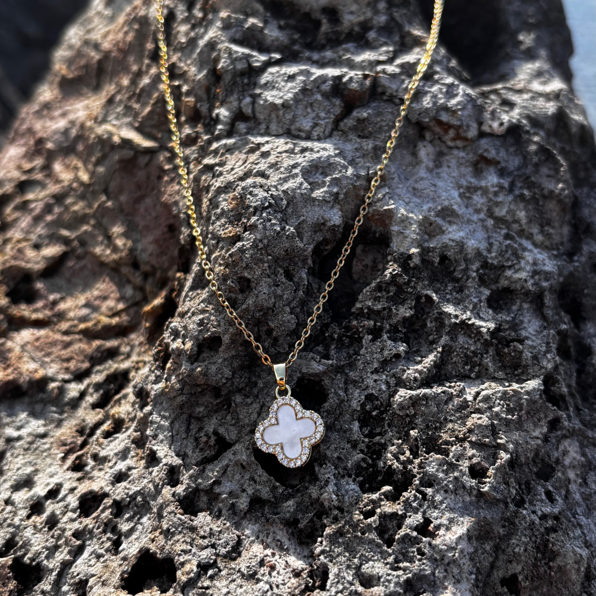 Gold - Beyaz Taşlı Yonca Kolye