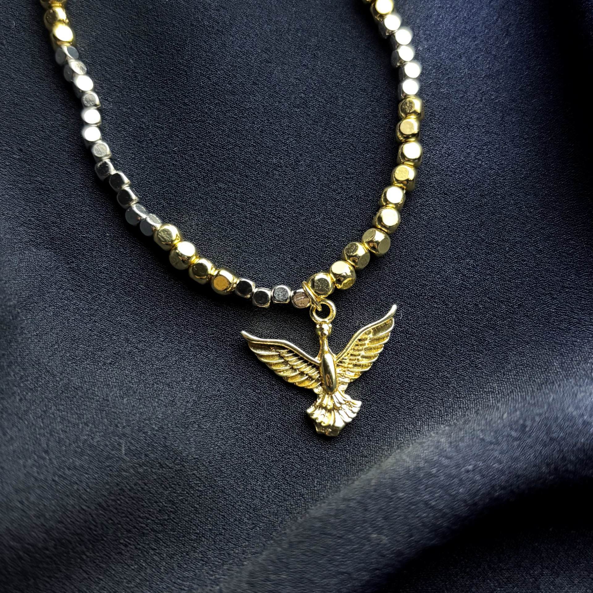 Gold - Gümüş Küp Bohem Anka Kuşu Kolye, bu güçlü anlamı modern ve şık tasarımıyla buluşturarak stilinize eşsiz bir dokunuş katıyor. Gold ve gümüş renklerin uyumu, hem klasik hem de bohem tarzı benimseyenler için mükemmel bir seçenek sunuyor.