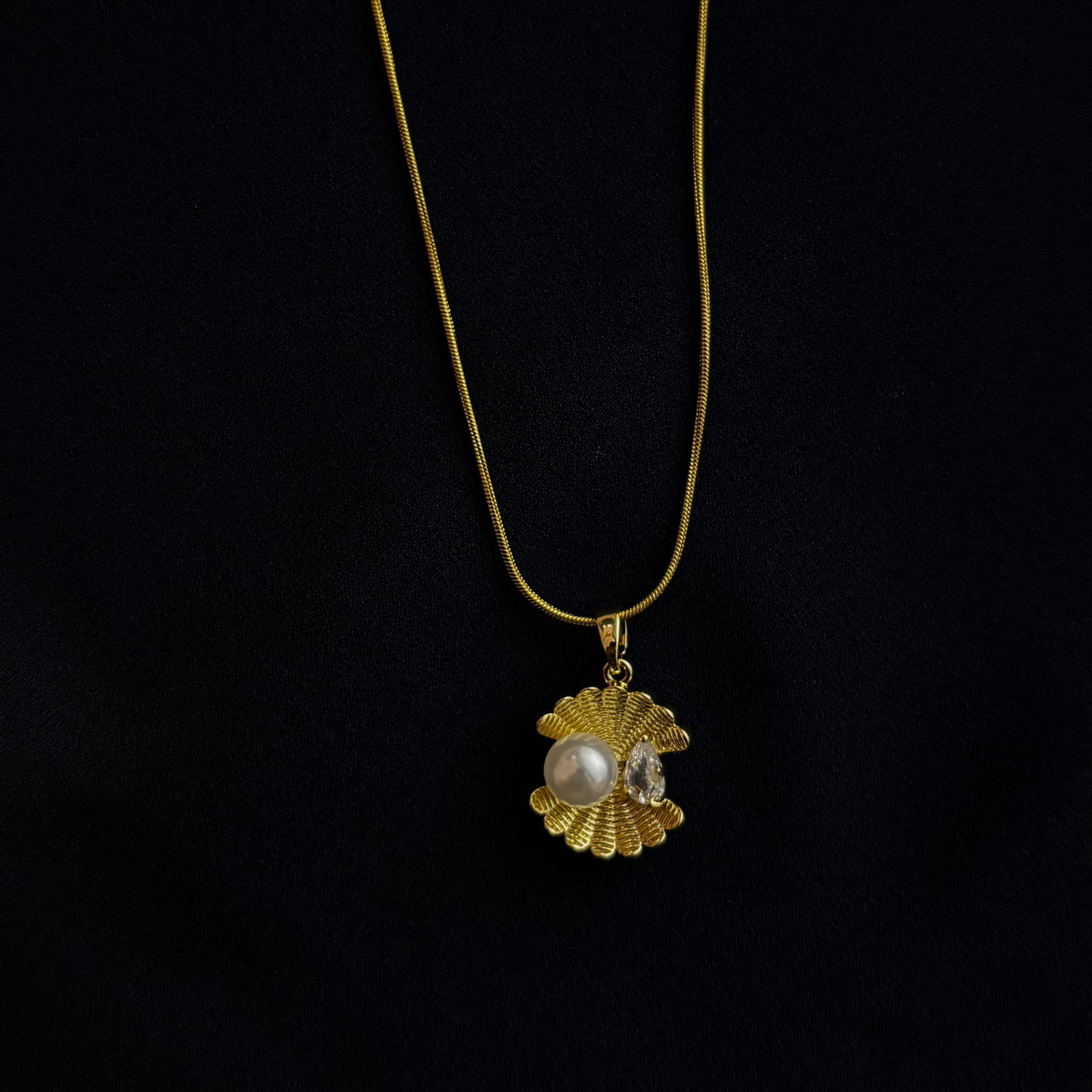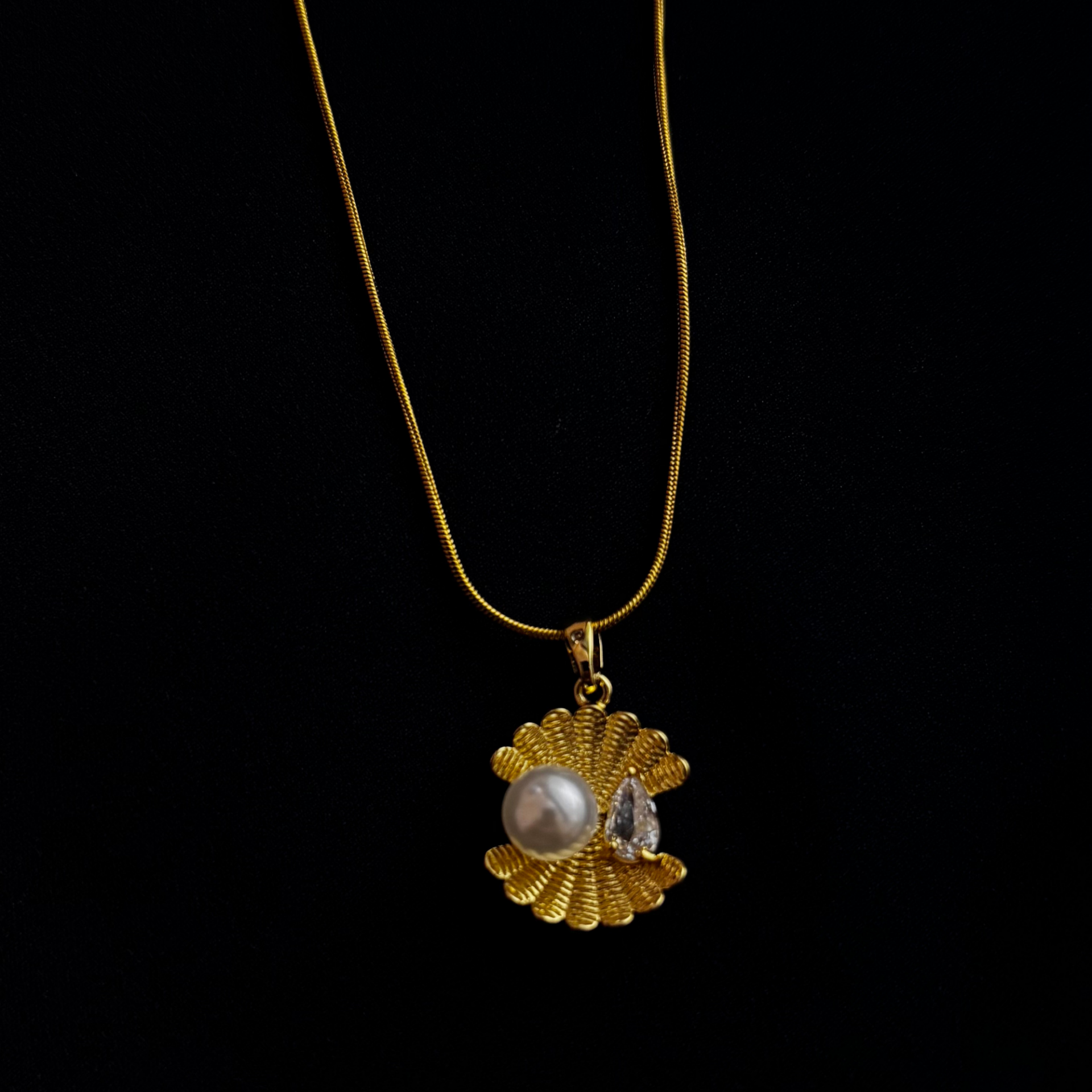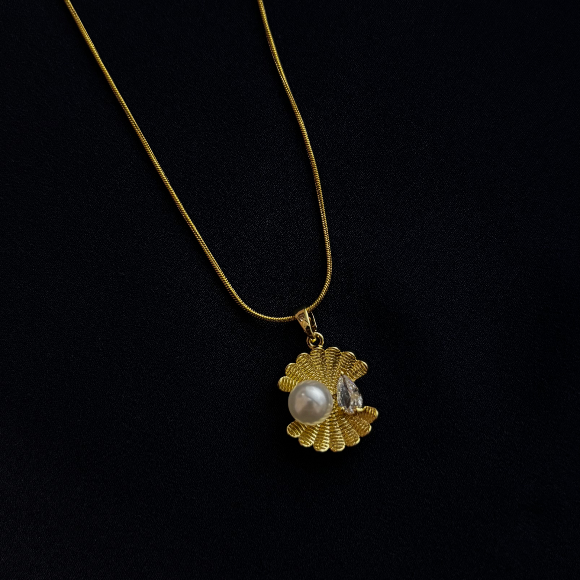 Glossy Jewelery'nin özel Okyanus Koleksiyonu’ndan İnci Detaylı İstiridye Kolye, doğallığın zarafetiyle tasarlanmış zamansız bir parçadır.