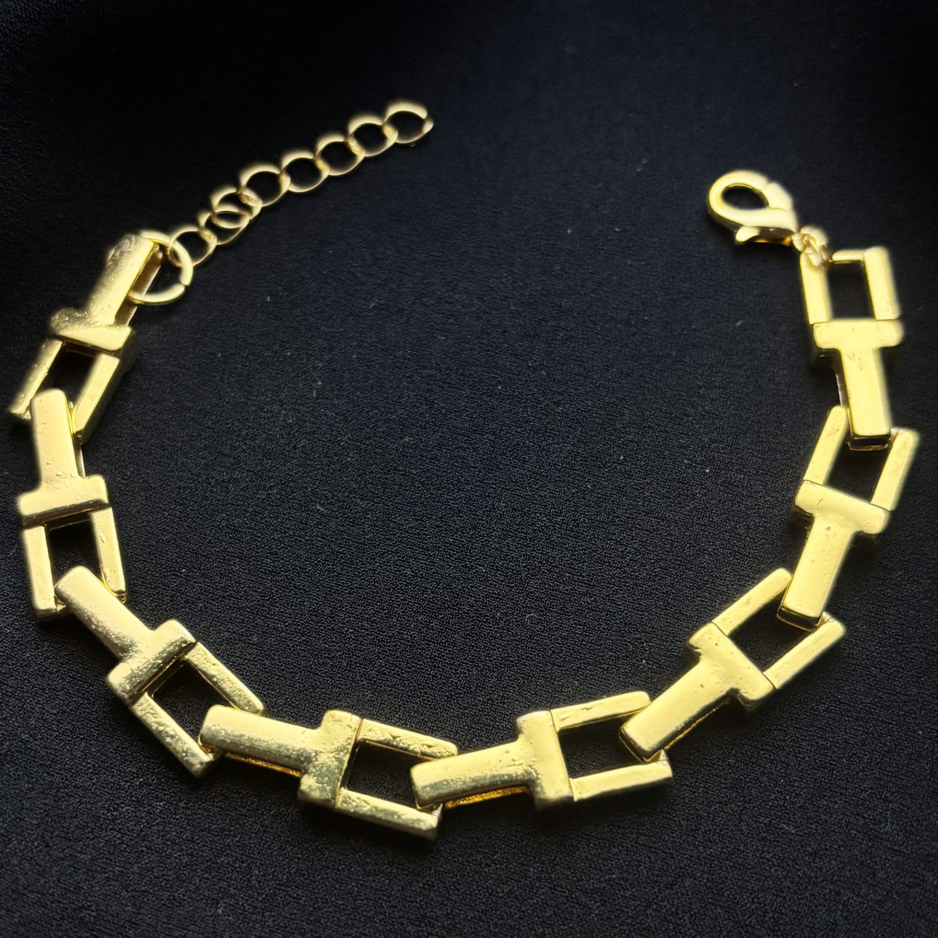Geometrik zarafeti gold ışıltıyla buluşturan Gold Kare Bileklik, sade ama çarpıcı stil arayanlar için özel olarak tasarlandı. Kare form detaylarıyla modern bir duruş sergilerken, parlak gold tonu ile her kombine sofistike bir dokunuş katıyor.