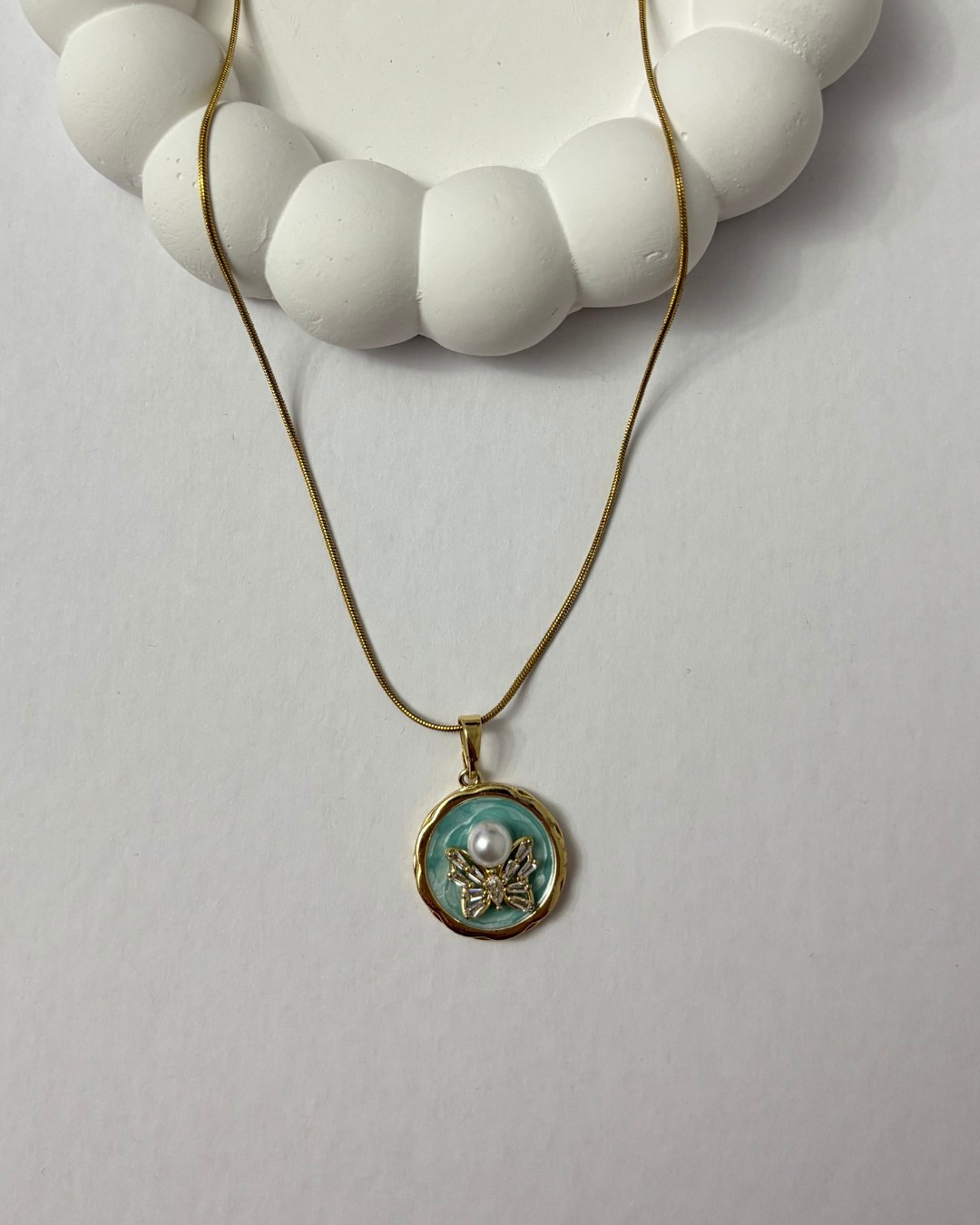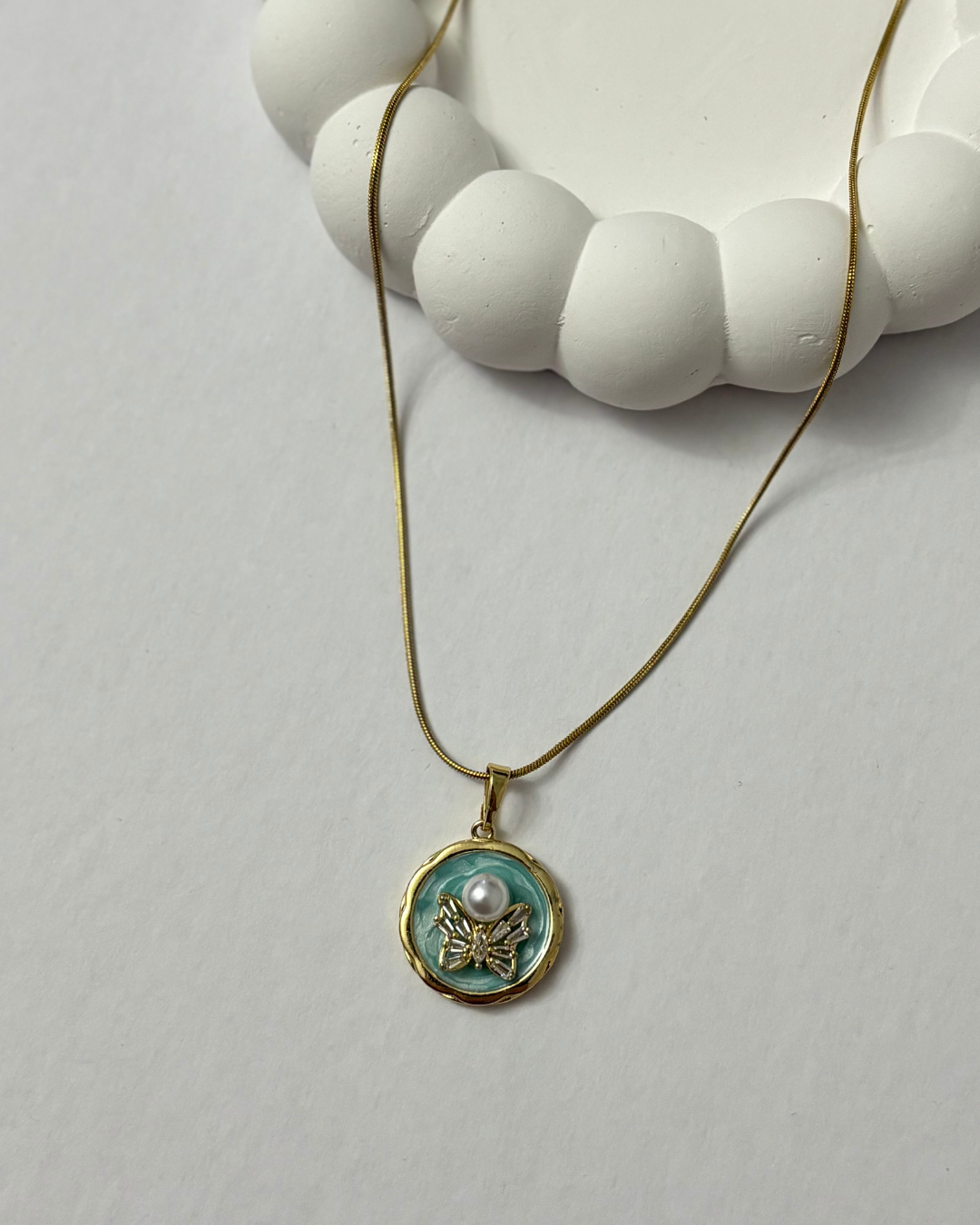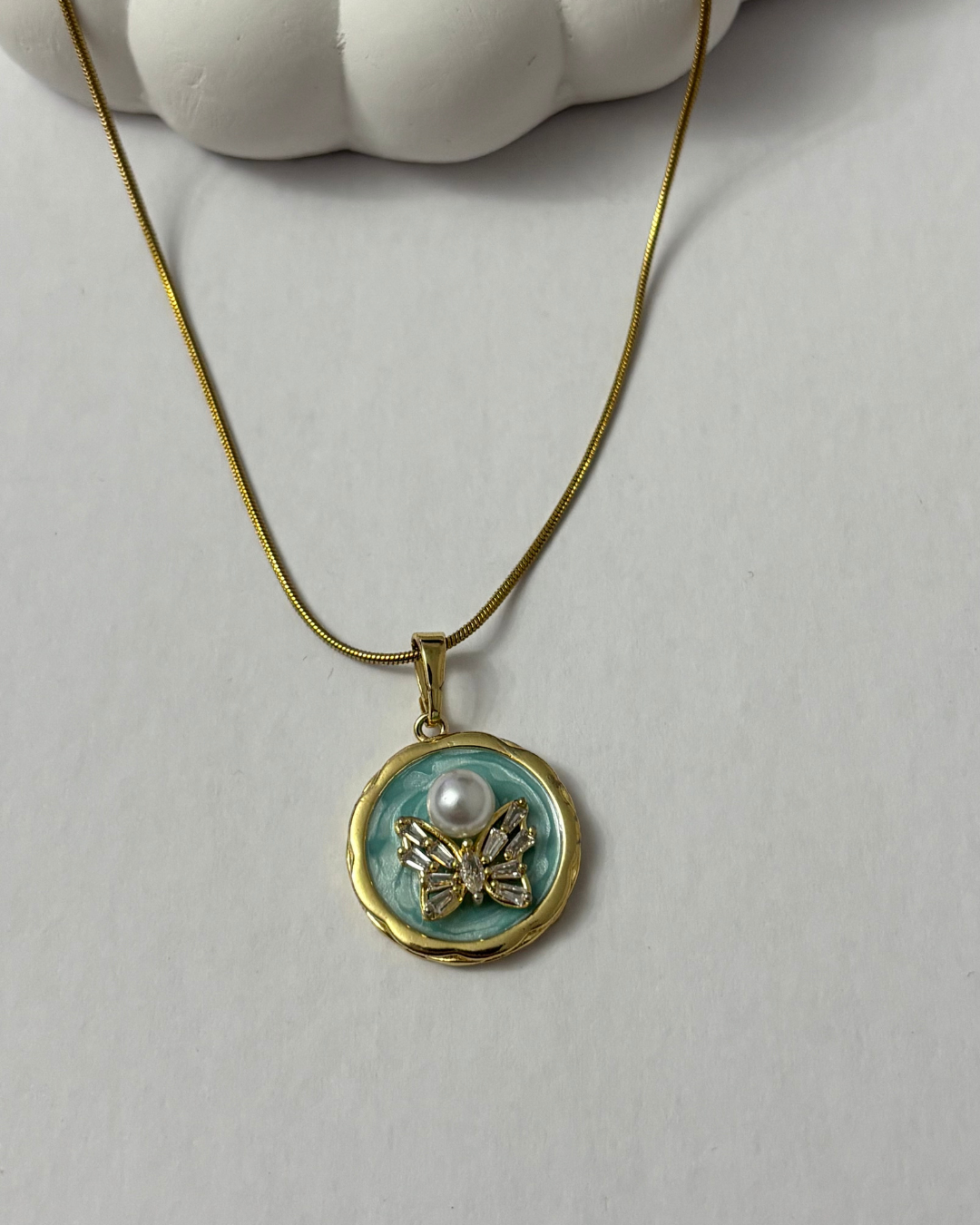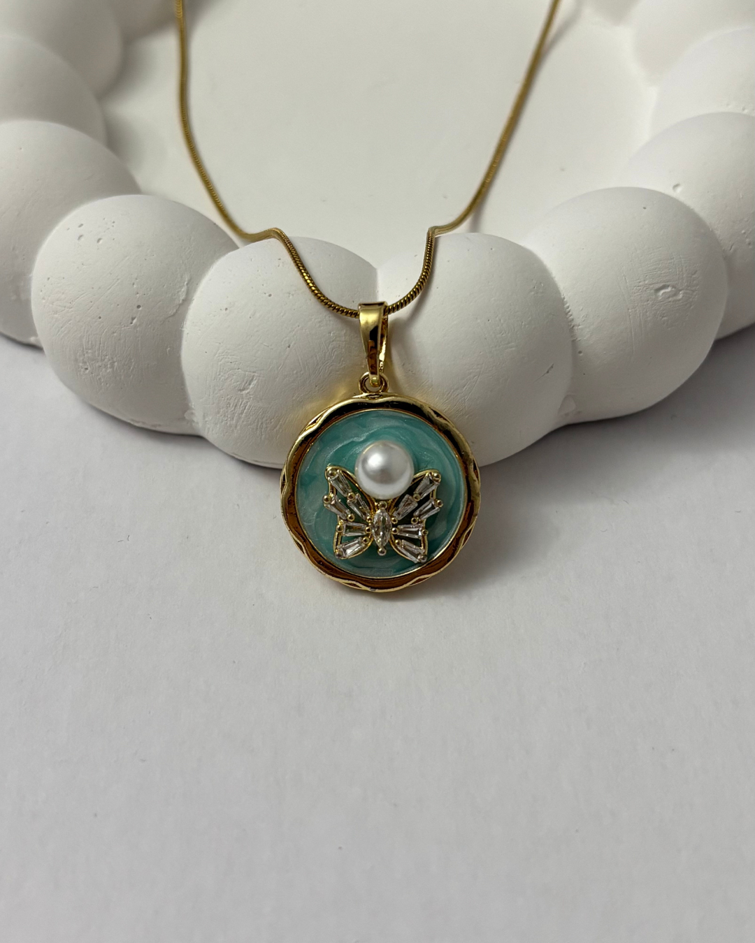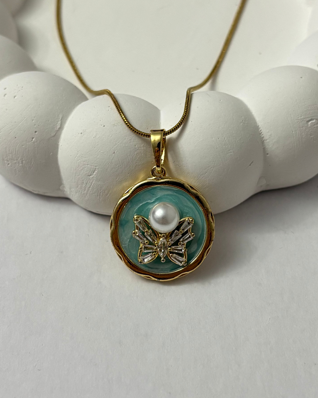 Glossy Jewelery'nin özel tasarımı Mineli İnci Detaylı Kelebek Desenli Kolye, doğanın bu eşsiz anını zarafetle yakalıyor.