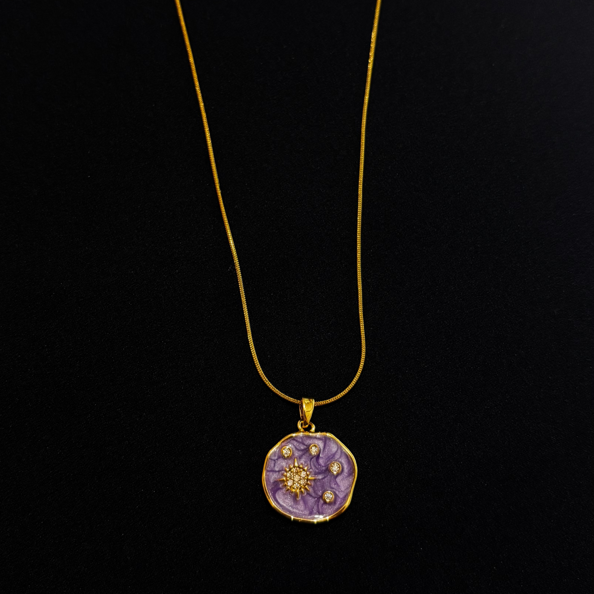 Mineli Mor Galaxy Kolye, yıldızların gizemini, morun asil enerjisiyle buluşturarak her stile kozmik bir dokunuş kazandırıyor.