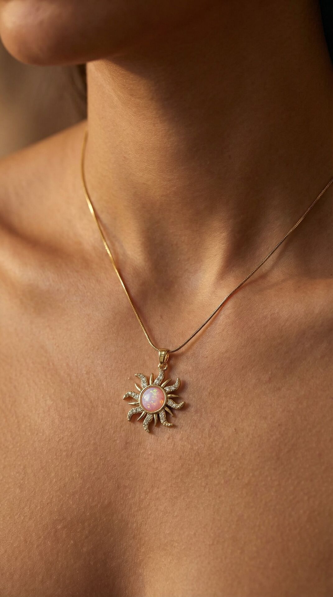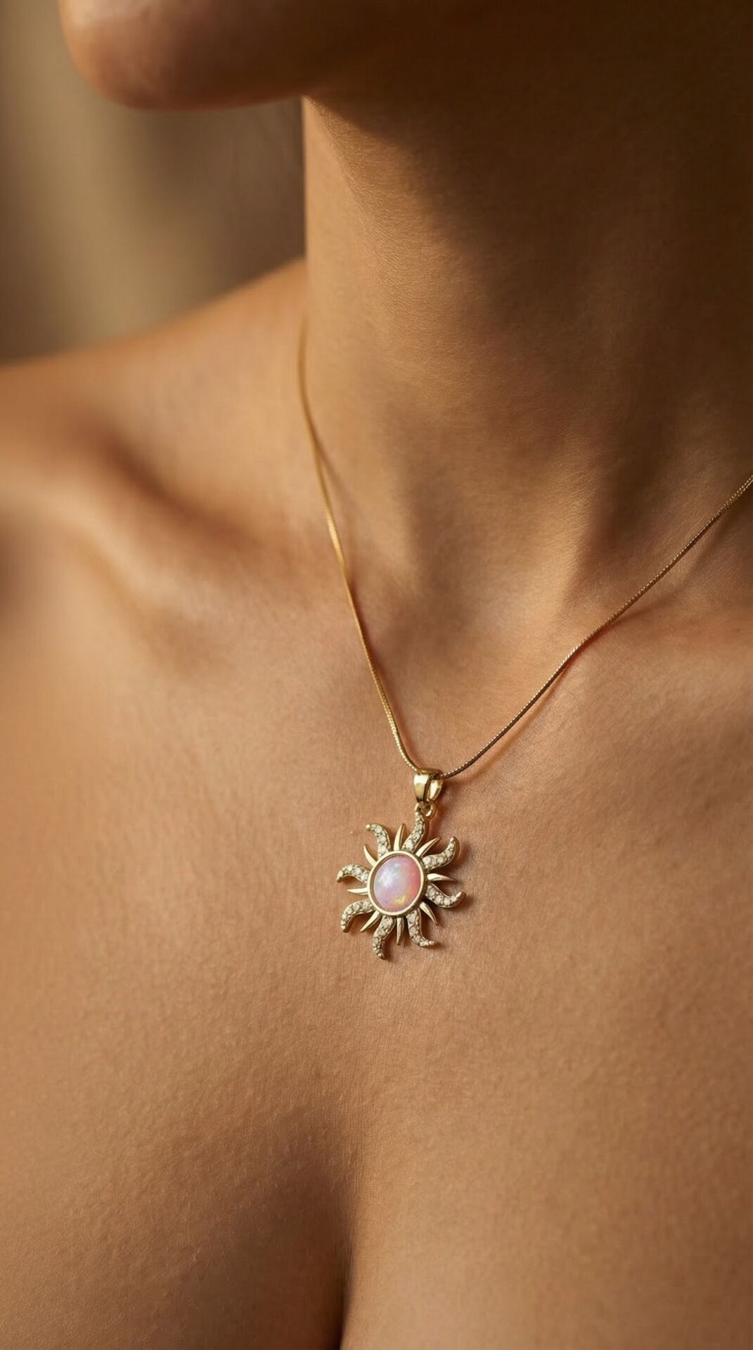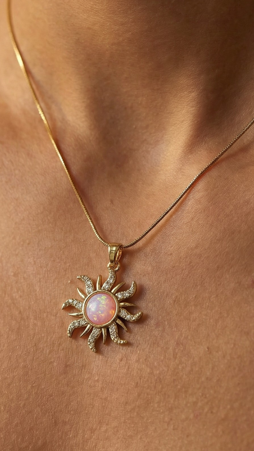 Glossy Jewelery'nin özgün tasarımı Mineli Zirkon Taşlı Güneş Desenli Kolye, enerjiyi ve zarafeti aynı formda buluşturuyor.