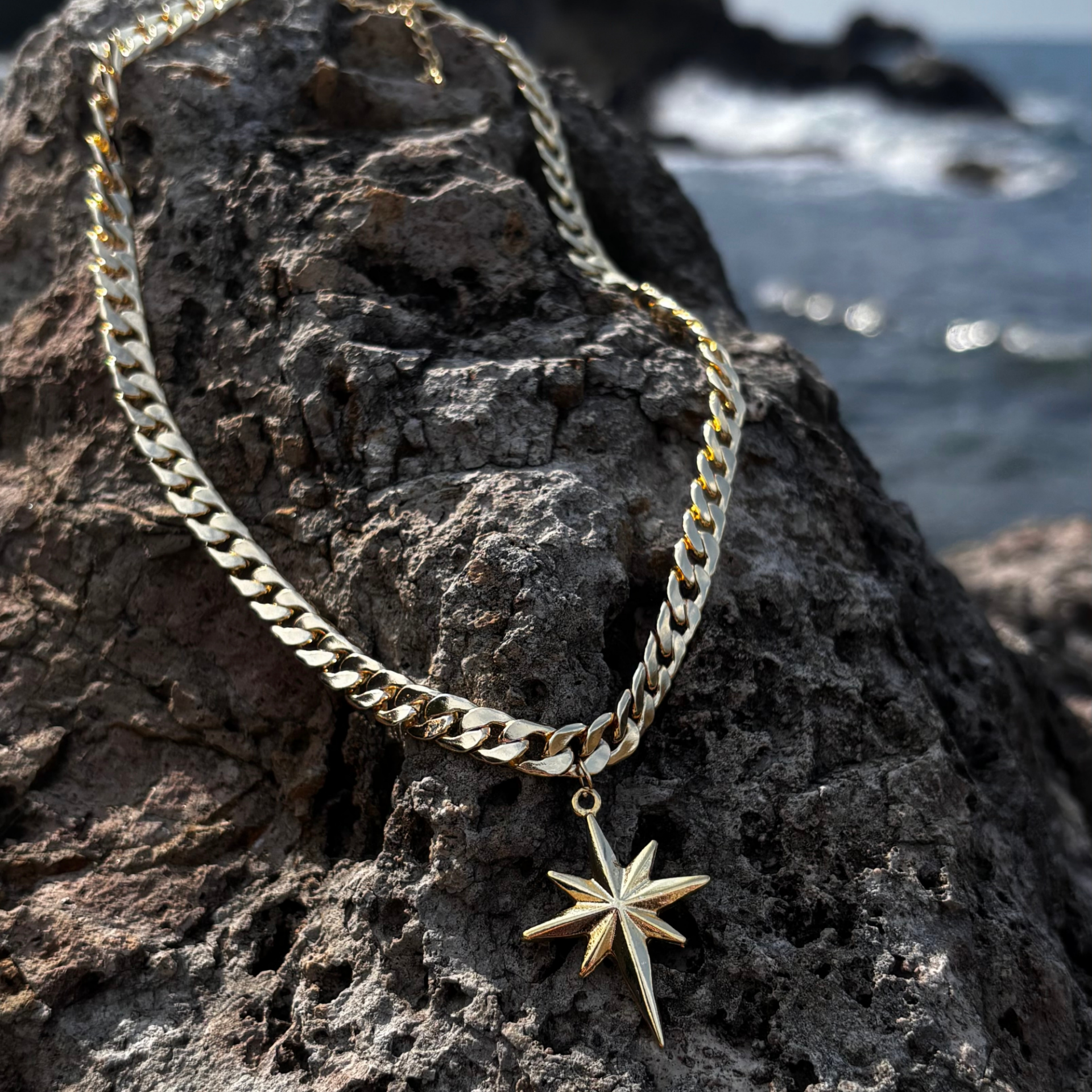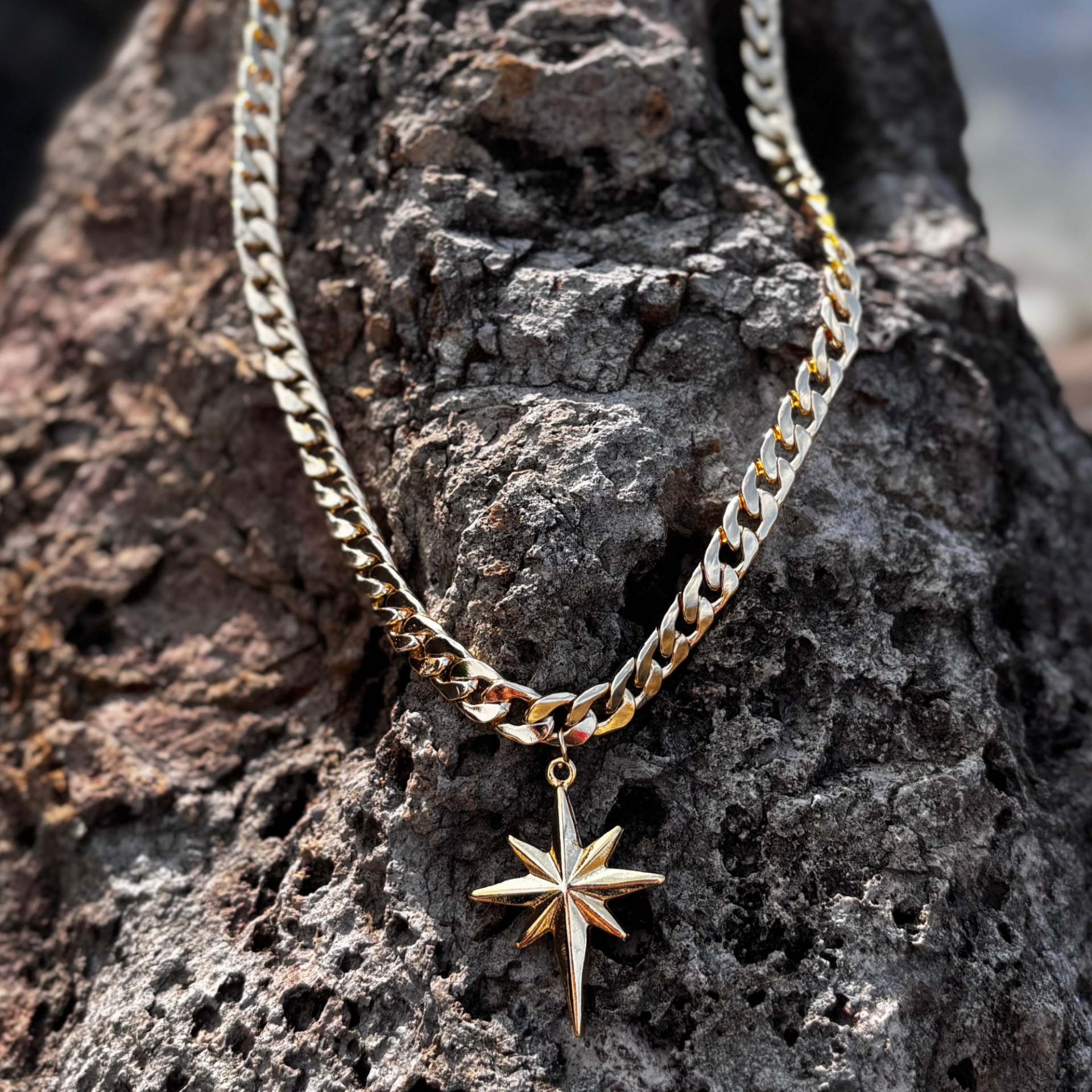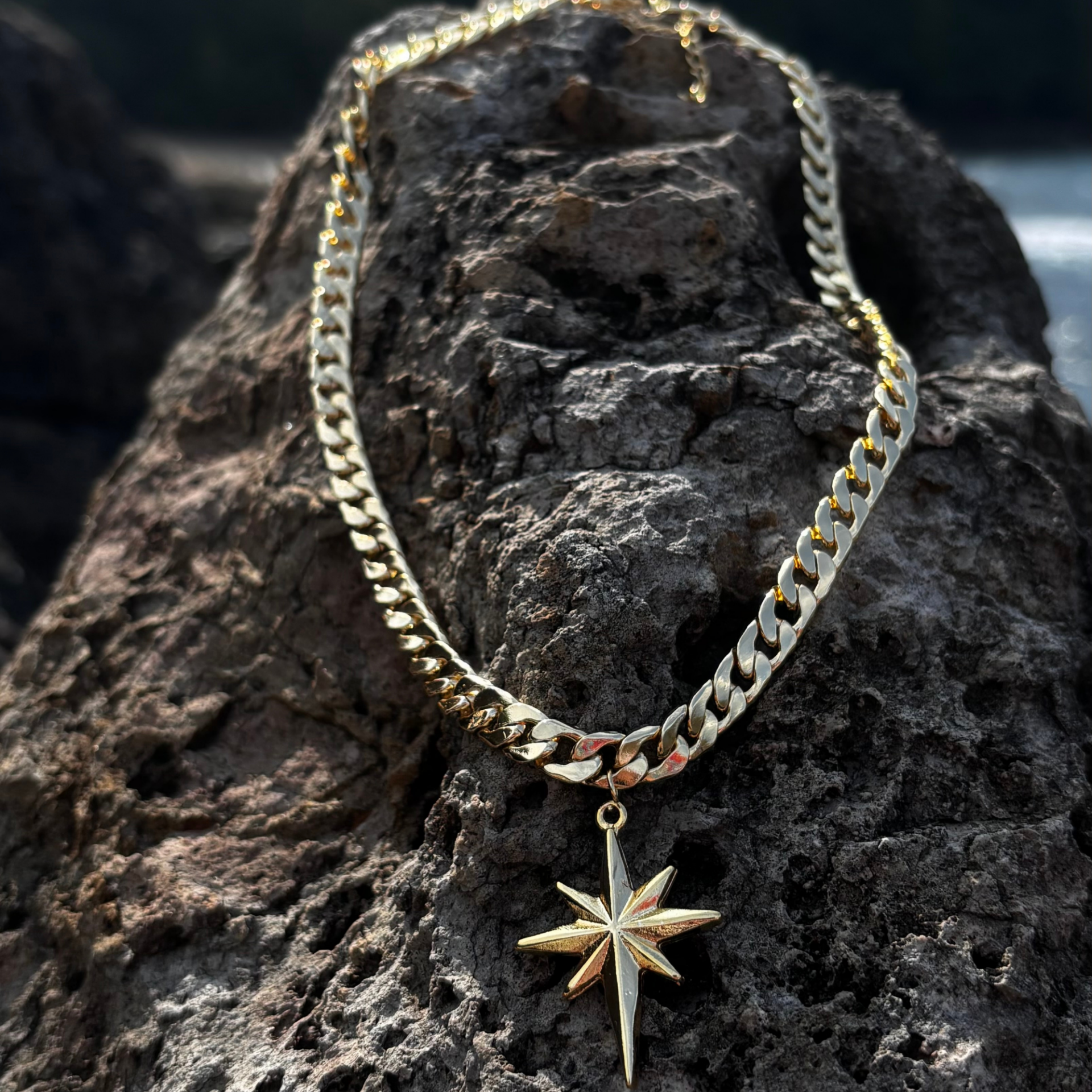 Kalın gold zincirin güçlü duruşu, Kuzey Yıldızı motifinin anlamlı enerjisiyle tamamlandı. Bu özel tasarım; kararlılığı, yön bulmayı ve içsel rehberliği simgeler. Her adımınızda kendinize güveninizi yansıtır, ışığınızla yol gösterirsiniz.