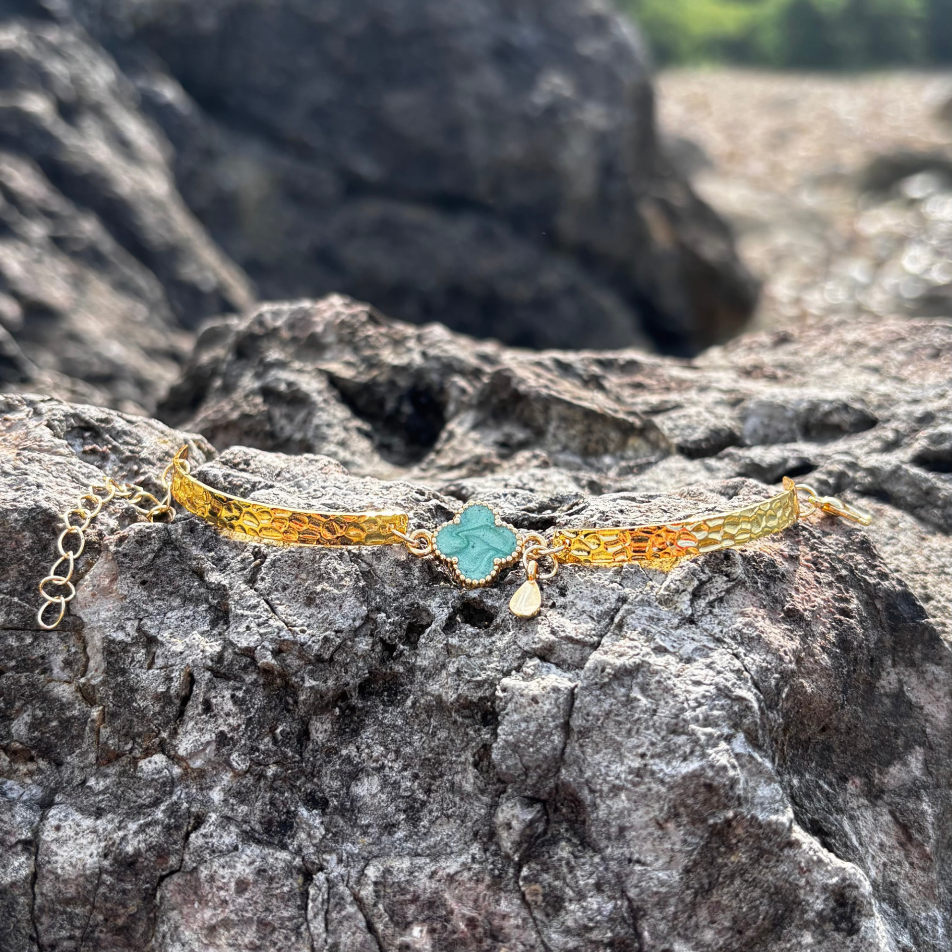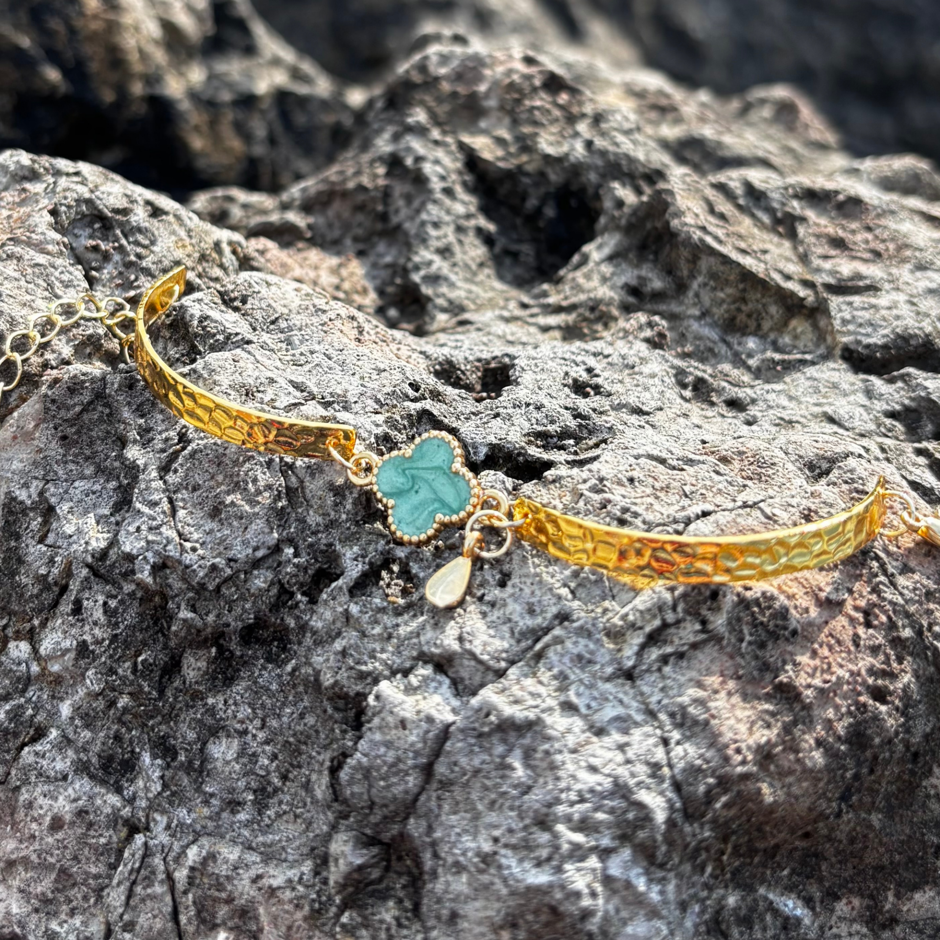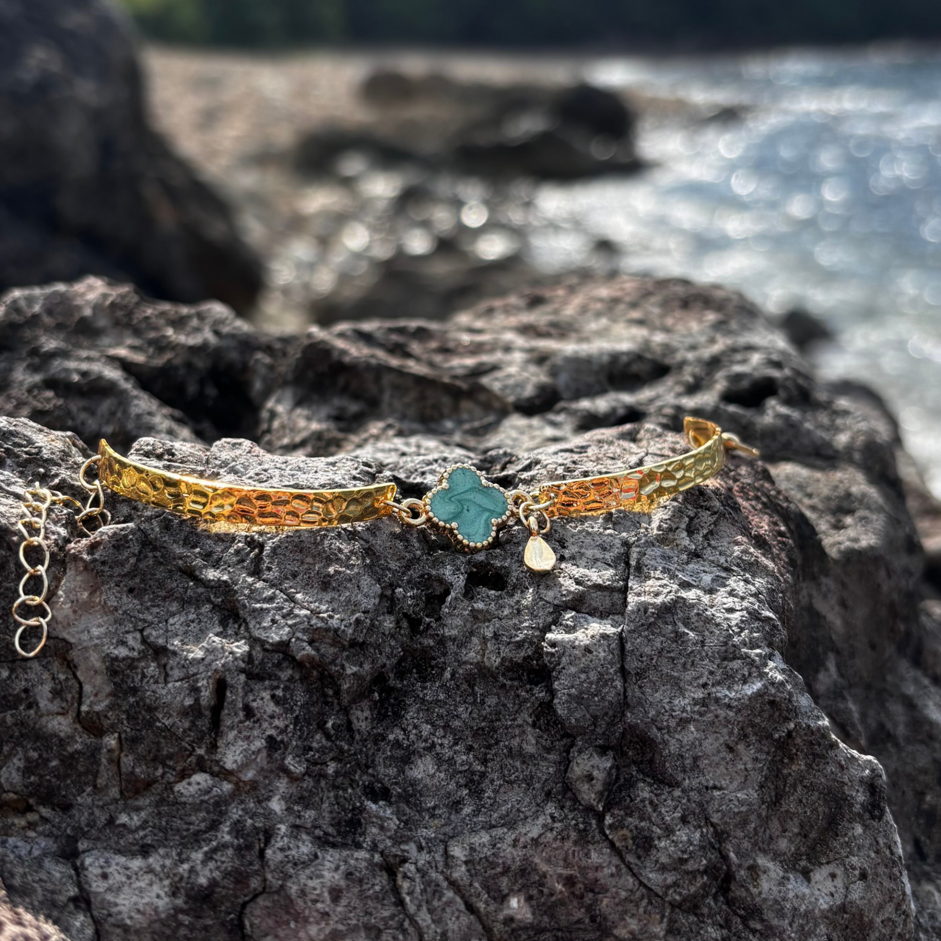 Yeşilin dinginliğiyle birleşen gold ışıltı, bu zarif kelepçe bilekliği hem anlamlı hem de göz alıcı bir parçaya dönüştürüyor.