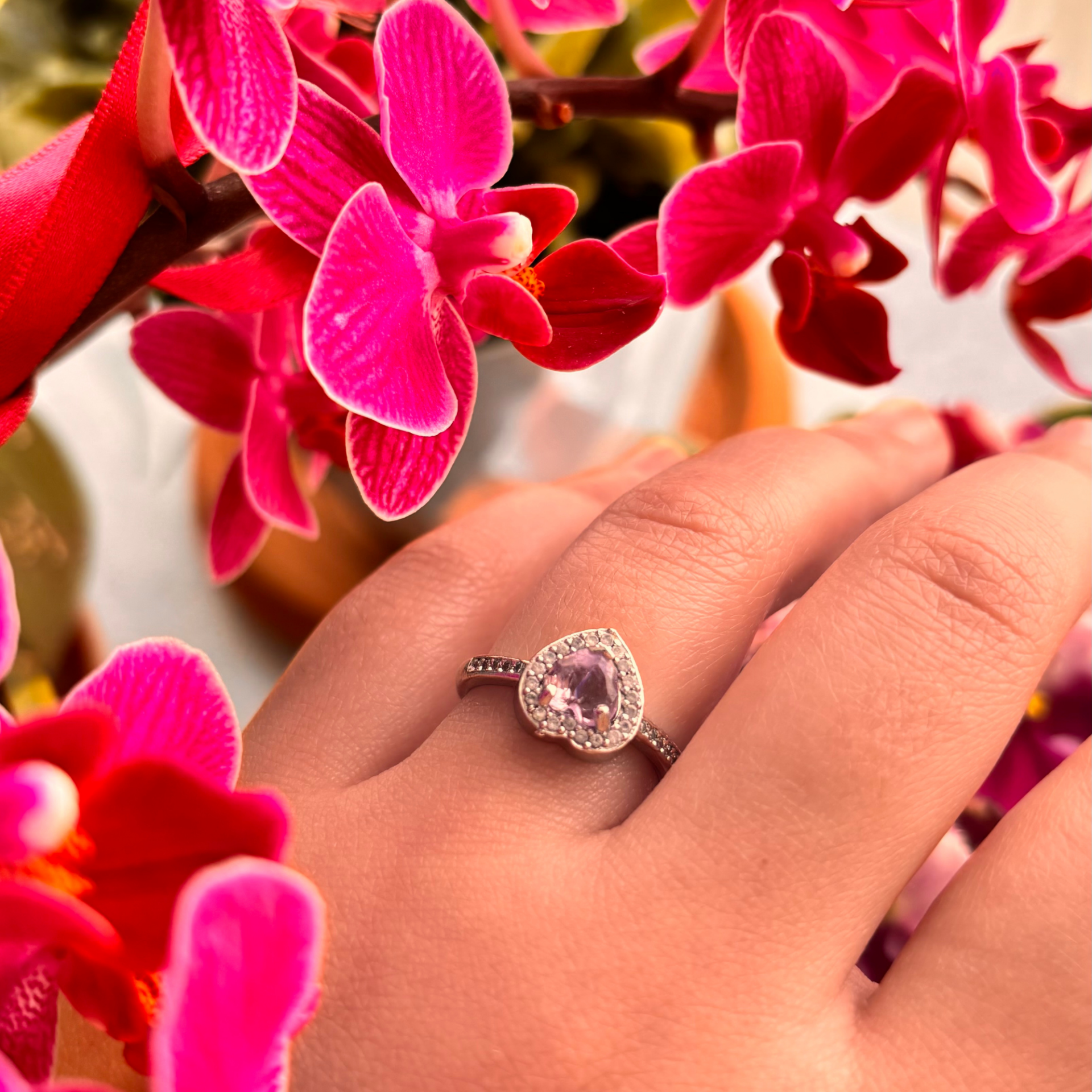 Glossy Jewelery’nin gümüş tonlu Pembe Taşlı Kalp Yüzük tasarımı, kalp formunun duygusal enerjisini modern bir yorumla yeniden tanımlıyor.