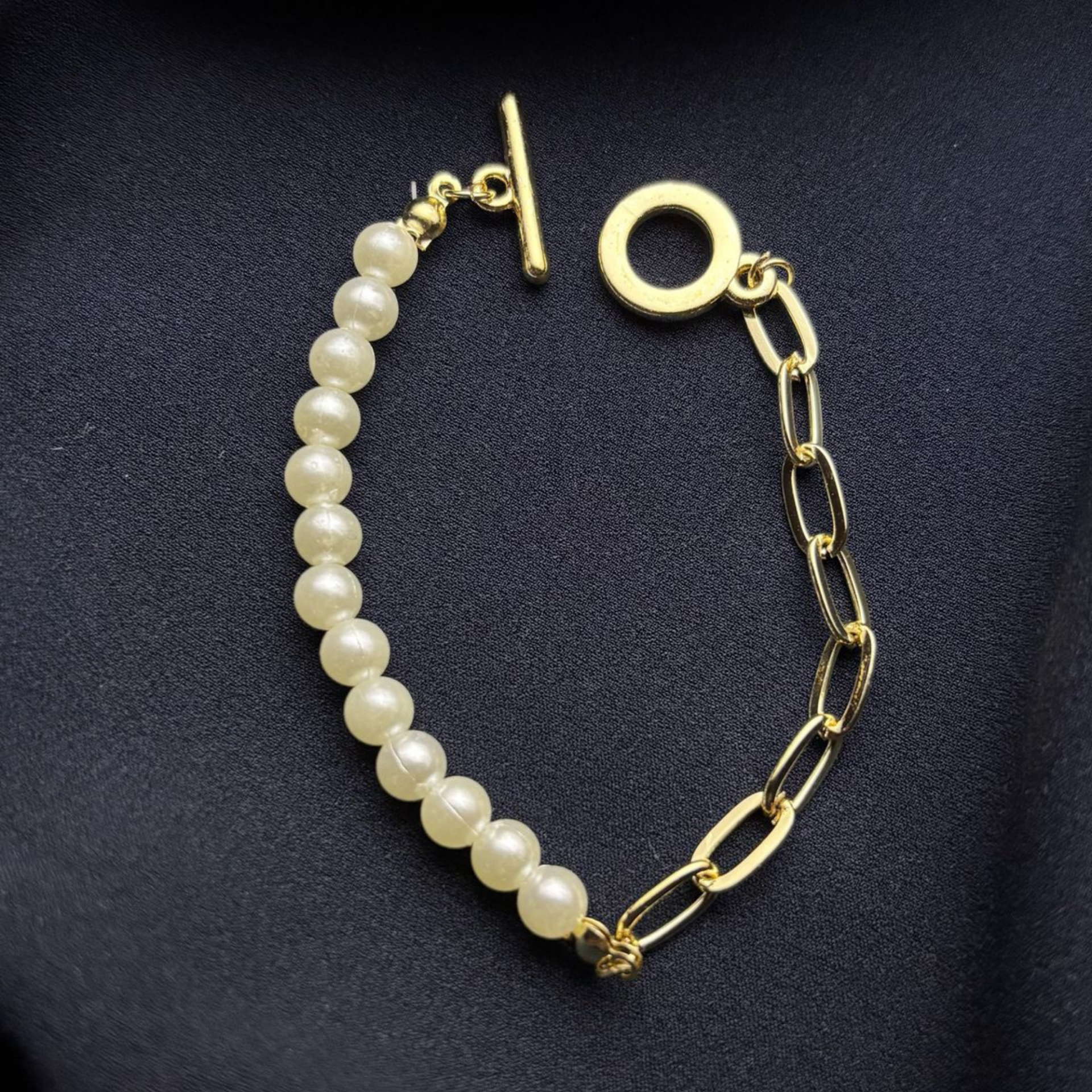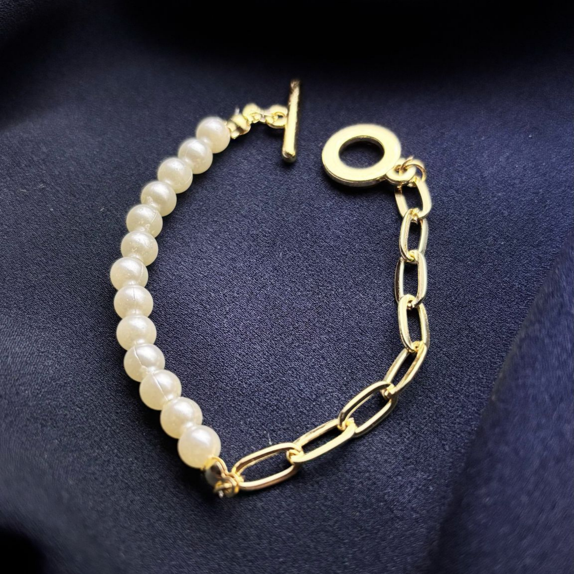 Şıklığın ve zarafetin modern yorumuyla tasarlanan İncili T Kilitli Zincirli Bileklik, klasik incilerle güçlü zincir detaylarını bir araya getiriyor. T kilit mekanizması, hem pratik kullanım sunar hem de bilekliğe sofistike bir hava katar.
